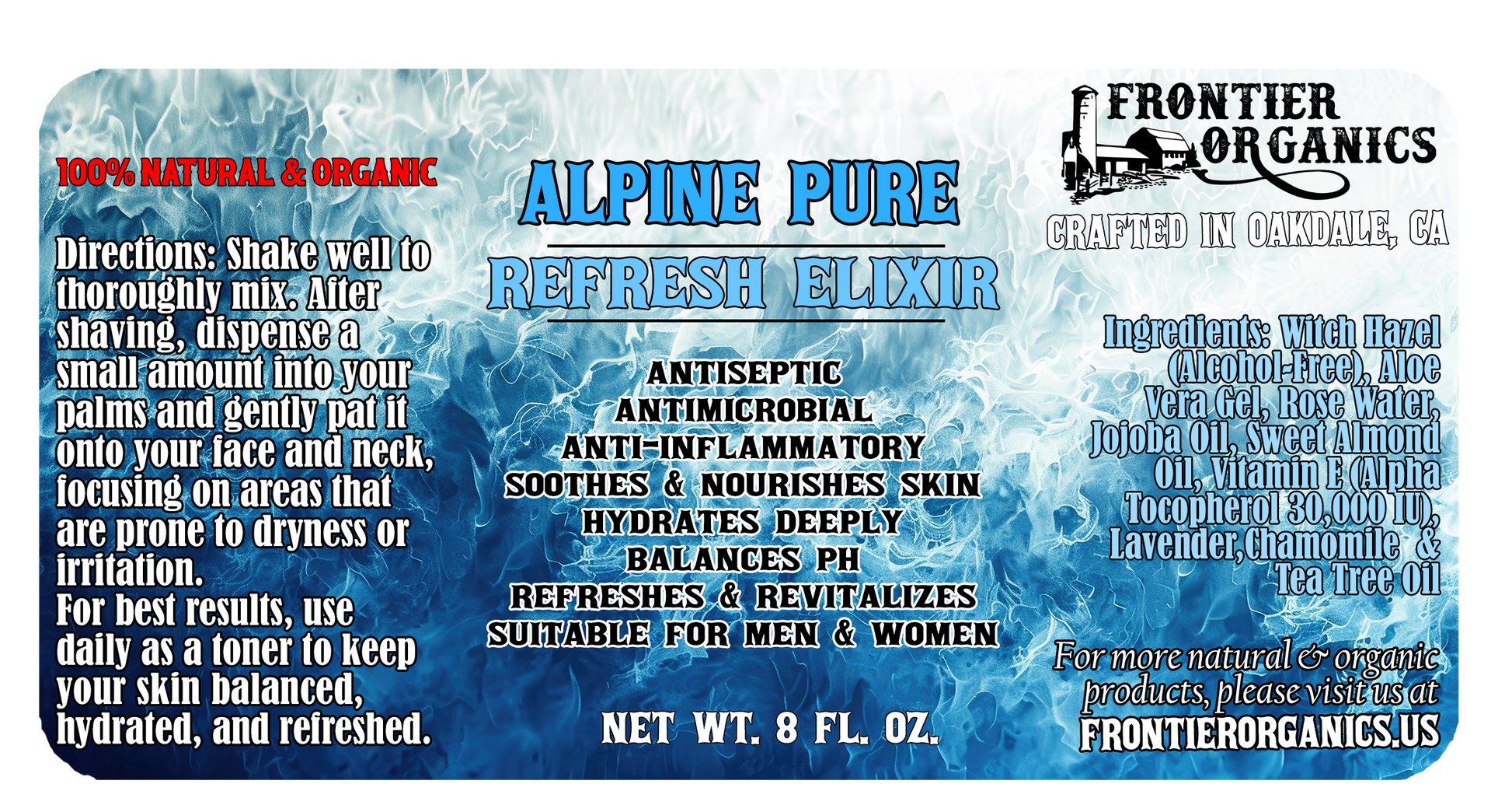 Discover the ultimate in skin care with Alpine Pure Refresh Elixir, your go-to solution for soothing, hydrating, and revitalizing your skin after every shave. This luxurious aftershave and toner is crafted with the finest all-natural and organic ingredients, delivering a refreshing experience for both men and women. Packaged in a generous 8oz bottle, our elixir is designed to provide long-lasting benefits, setting a new standard in skin care.